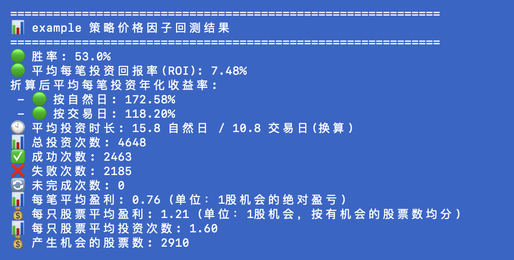 请注意:在example策略以及注册后自带的另外两个策略(随机和动量策略)里您都会看到价格策略回测模拟ROI(收益)都是正的,但这并不代表这些策略在实际中可以获利。如果您使用 python3 start-cli.py -sa 命令跑动量策略,您就会发现在价格模拟回测(-sp)中ROI为正但实际收益模拟(-sa)中策略却会亏损,所以,不同策略的模拟有不同的作用。价格模拟回测更偏向想法可不可行,实盘带价格因子的模拟更接近于真实的操盘模拟,您可能会发现不同的资金管理策略会导致在价格模拟中出现的正收益实际变成负的盈利。这套框架是本着严谨的态度为大家能真实做出可盈利模型而去的,请大家在使用回测模型前理解每个回测的行为的意义,并做出相应改动从而真正获利。